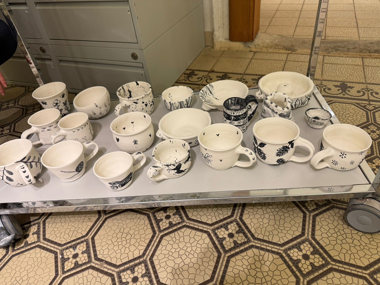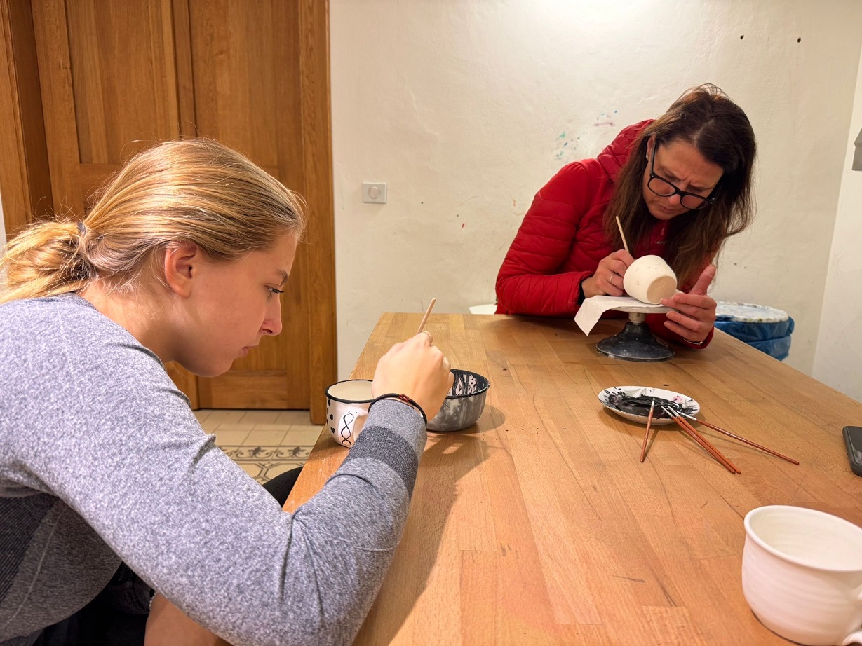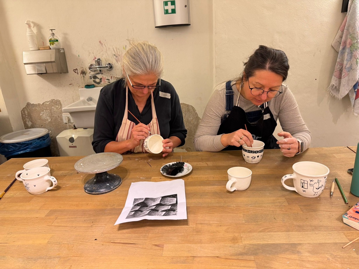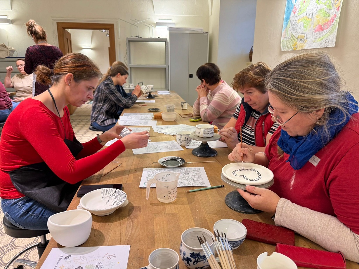 Dílna malování hrnků kobaltovou glazurou vedli zkušení keramici VĚRA BENEŠOVÁ a MICHAL NEDVĚD.
